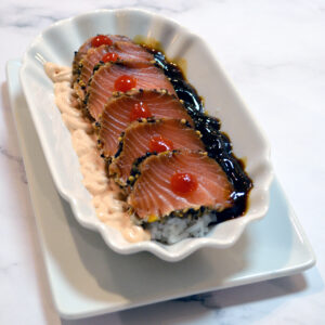 Pincho: Este plato ideal para compartir entre dos personas es muy energético por el pescado azul y el arroz, pero muy ligero al mismo tiempo por la forma en que se presenta. Las salsas que lo acompañan lo convierten en un pincho lleno de sabor y texturas.