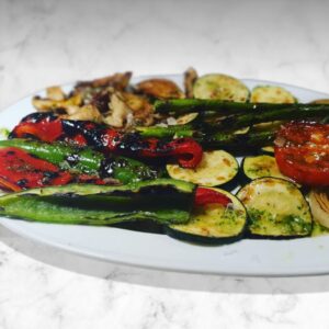 Pincho: Verduras frescas como el calabacín, berenjena, espárrago triguero y tomate, cocinadas a la plancha y bañadas con una salsa romesco casera. Este pincho no solo es saludable y ligero, también es apto para personas vegetarianas y veganas.