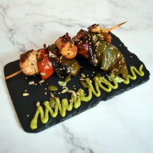 Pincho: Se trata de una brocheta de pollo con tomate y pimiento verde y acompañada de guacamole y unas semillas de calabaza. Un pincho con poco contenido calórico, ya que combina la carne magra con verduras y aporta grasas saludables como el aguacate y las semillas.